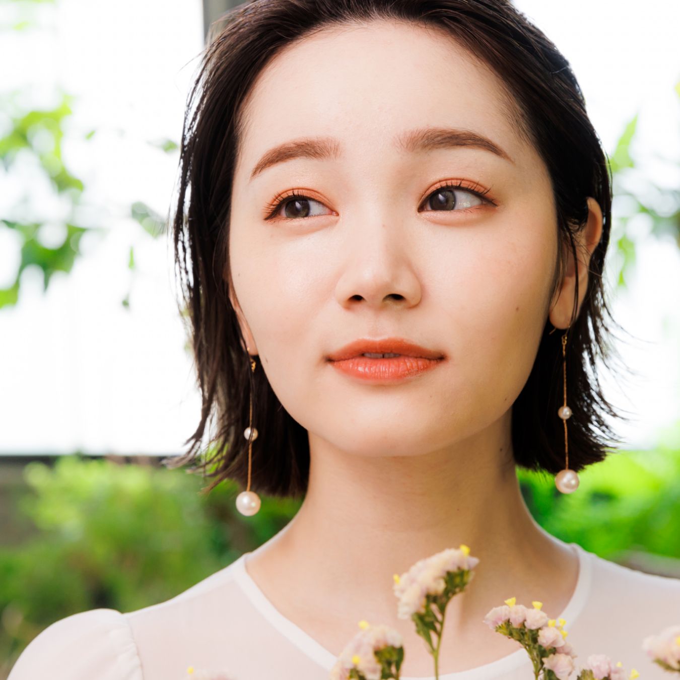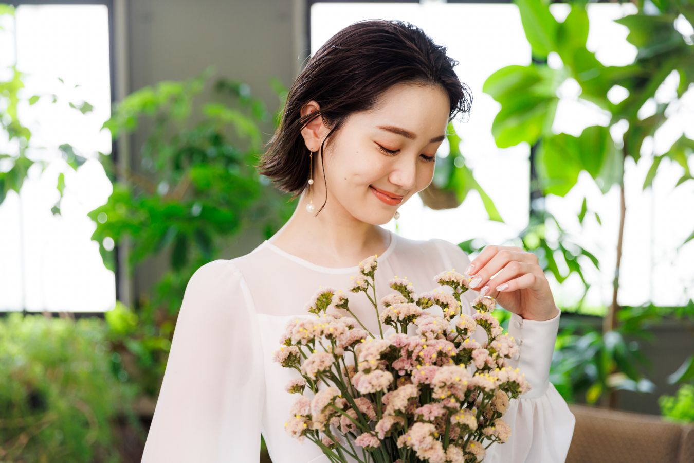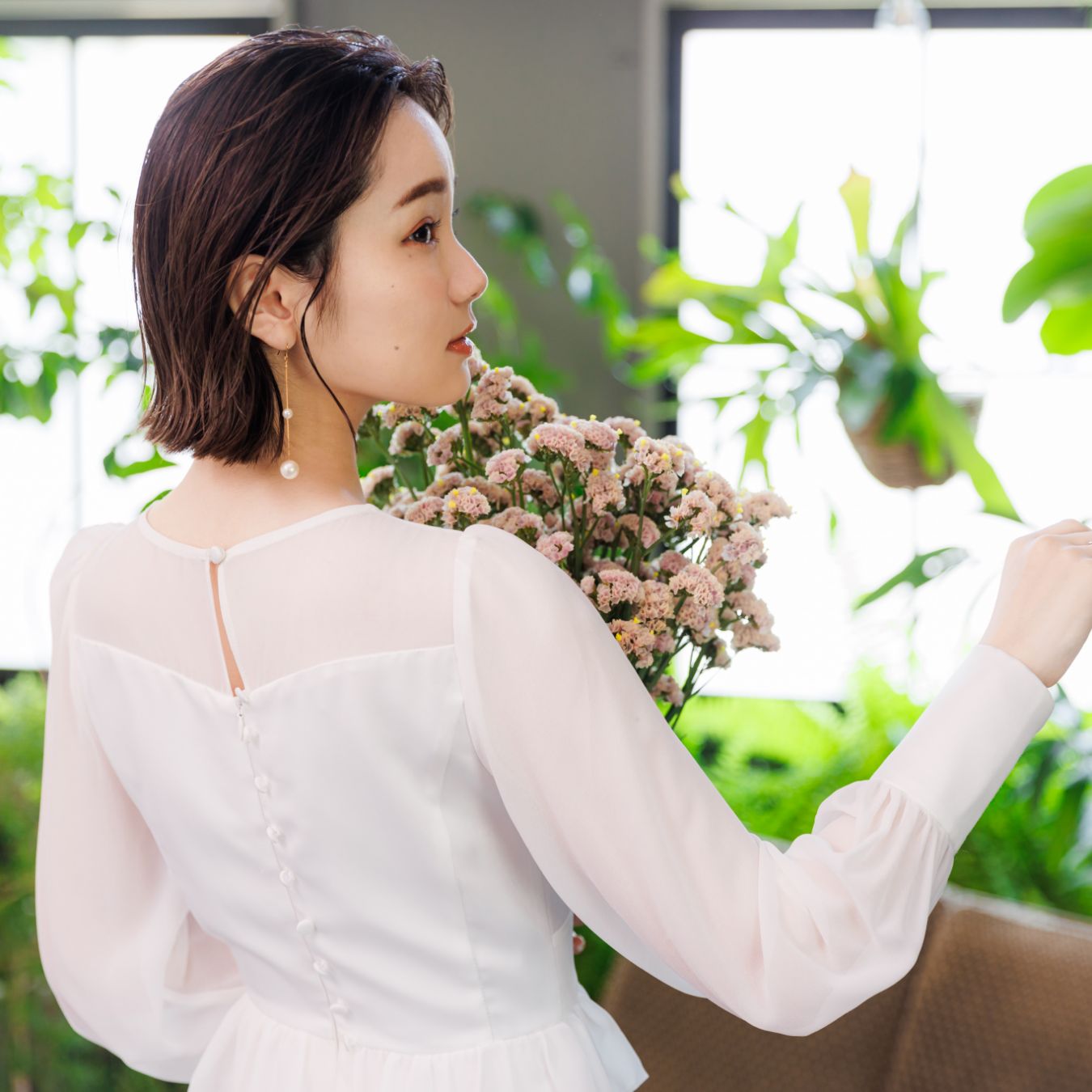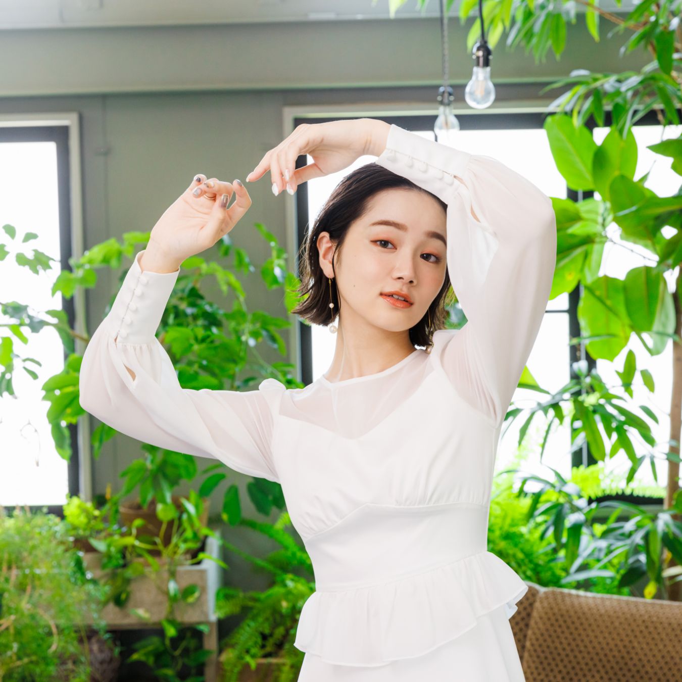 揺れるピアスをアクセントに
