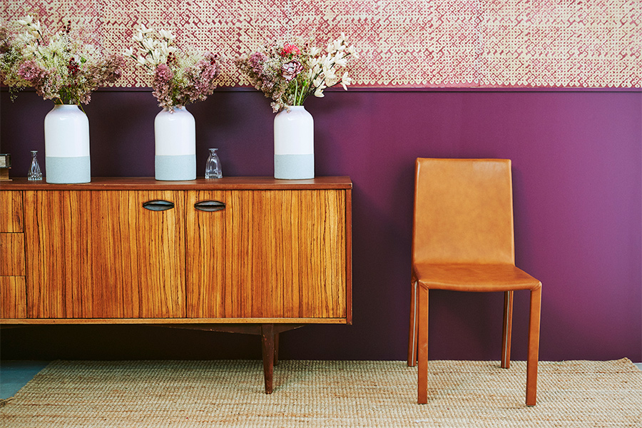 大人可愛いパープルでまとめた壁紙に木目のキャビネットが目を引くデザインの背景セット。