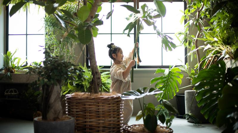 GREEN GREEN STUDIOのこだわりの一つが、自然光あふれる温室。木々や草花の清らかな香りに満たされたフォトスタジオ。ご家族の幸せな瞬間を鮮やかに彩ります。